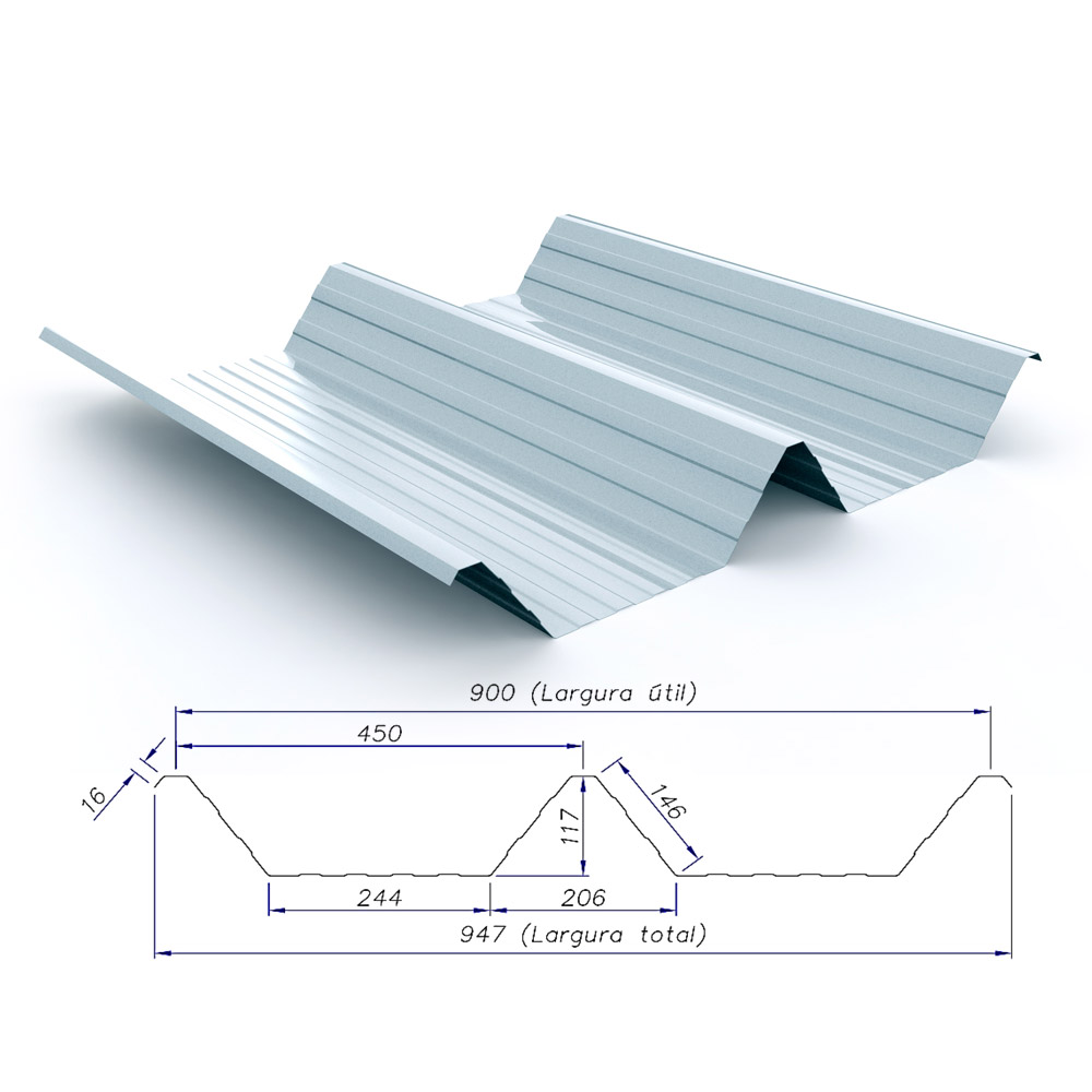 As telhas metálicas 120/900 são leves, resistentes e proporcionam montagem rápida, baixo custo, além de se adequarem a diferentes projetos. As telhas metálicas RT 120/900 podem ter até 13 metros de comprimento. Além disso, também podem ser transformadas em telhas curvas, do tipo multidobras, para um melhor acabamento e estética na obra. Raio mínimo de 600 mm, espessura 0,65 mm.