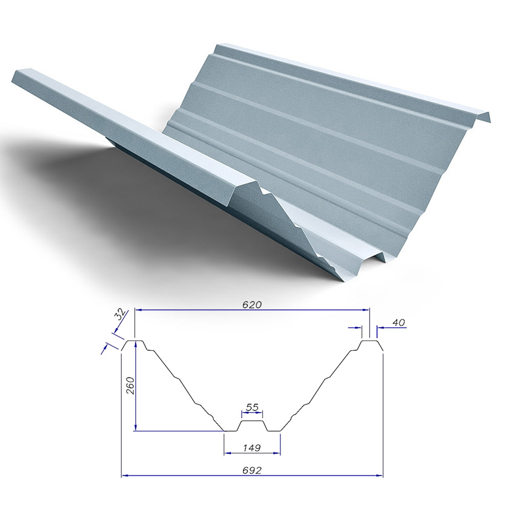 A Telha Trapezoidal RT 260/620 é produzida em aço Galvalume (Zincalume/Aluzinc). Indicada para uso em coberturas com grandes vãos, oferece durabilidade e resistência.